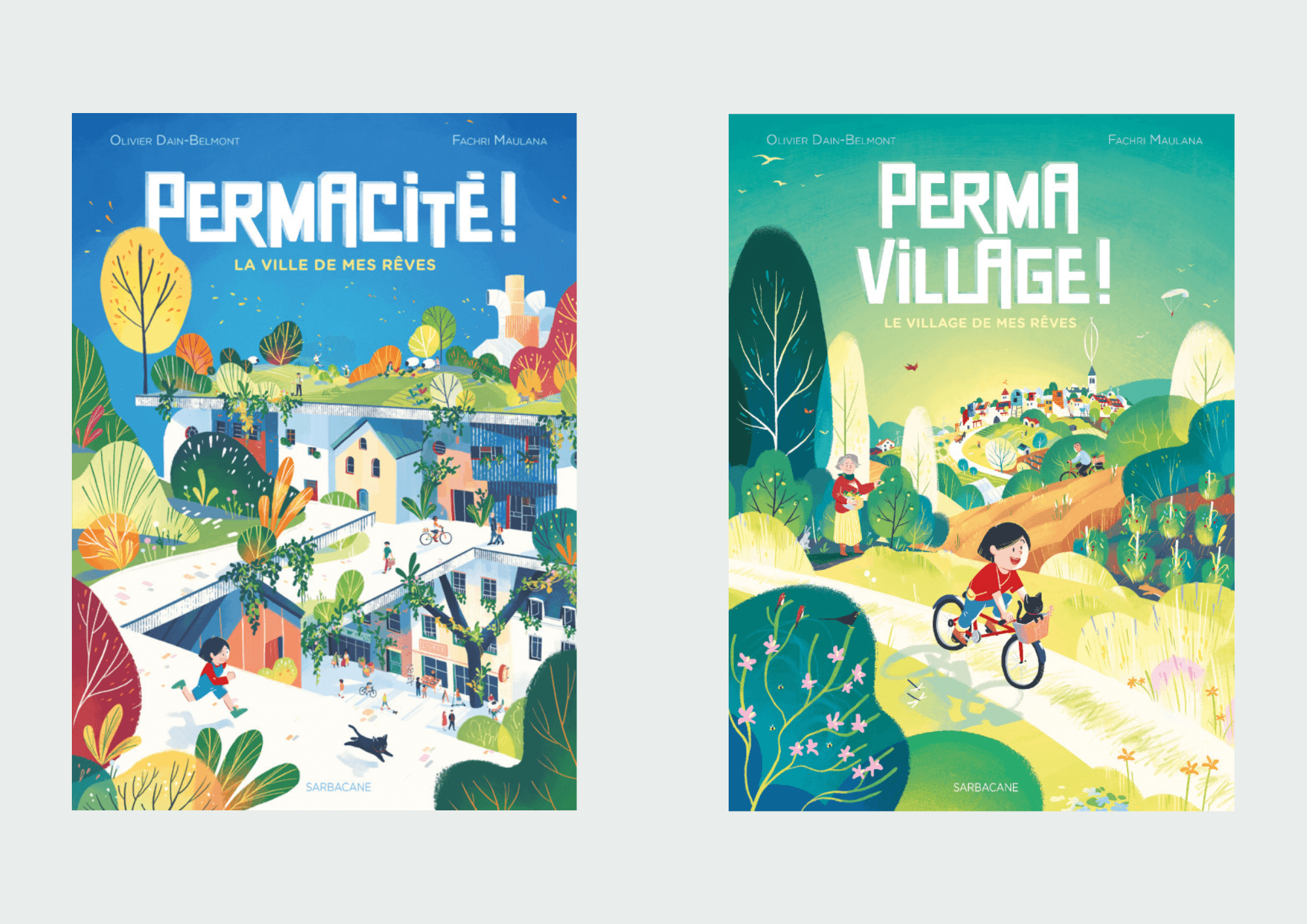 « Permacité ! La ville de mes rêves » et « Permavillage ! Le village de mes rêves » - Olivier Dain-Belmont, ill. Fachri Maulana (Sarbacane)