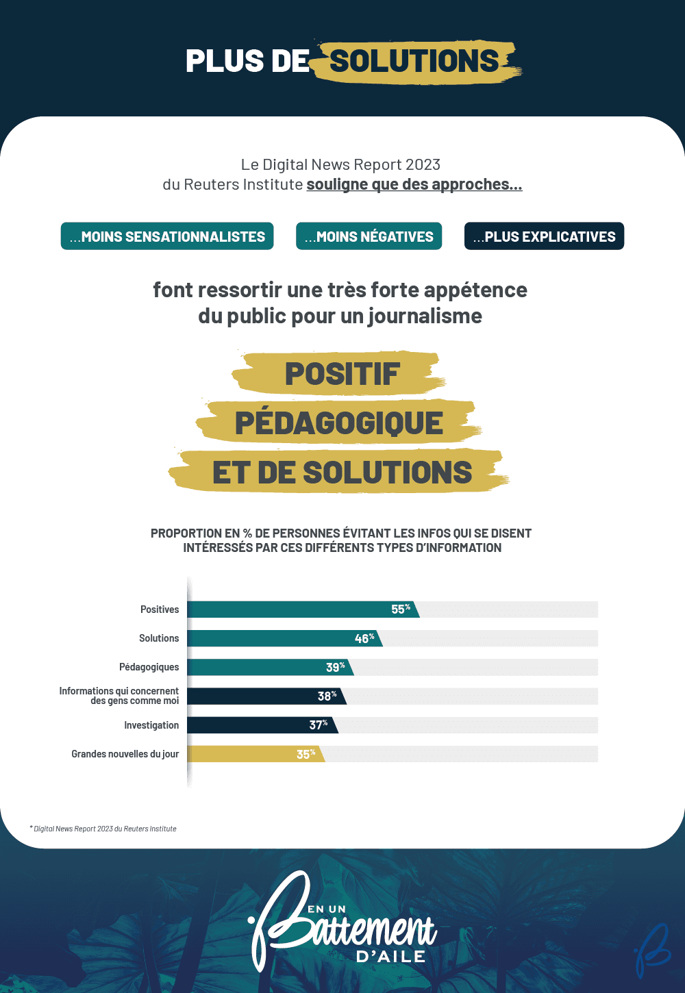 C'est dans cette optique qu’a été lancé En un battement d'aile, un média dédié à l'écologie, en adoptant une approche constructive grâce au journalisme de solutions.